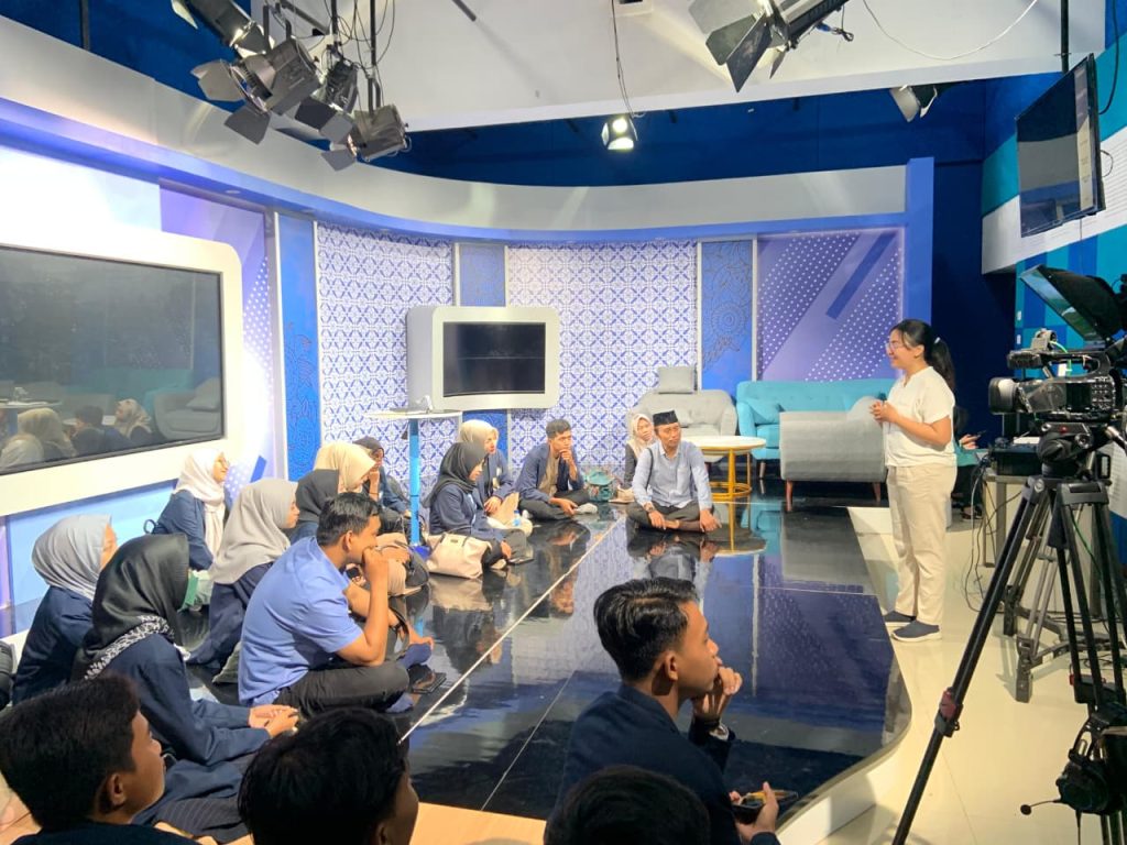 Rangkaian kegiatan dilanjutkan dengan eksplorasi ruang produksi siaran, meliputi Studio Produksi dan Master Control Room (MCR). Mahasiswa menyaksikan secara langsung proses pembuatan program televisi, mulai dari pengaturan kamera dan pencahayaan, hingga koordinasi tim produksi di balik layar. Di ruang MCR, mahasiswa mempelajari sistem pengendalian siaran secara real time, termasuk pengaturan transisi program serta pengecekan kualitas audio-visual sebelum tayang.